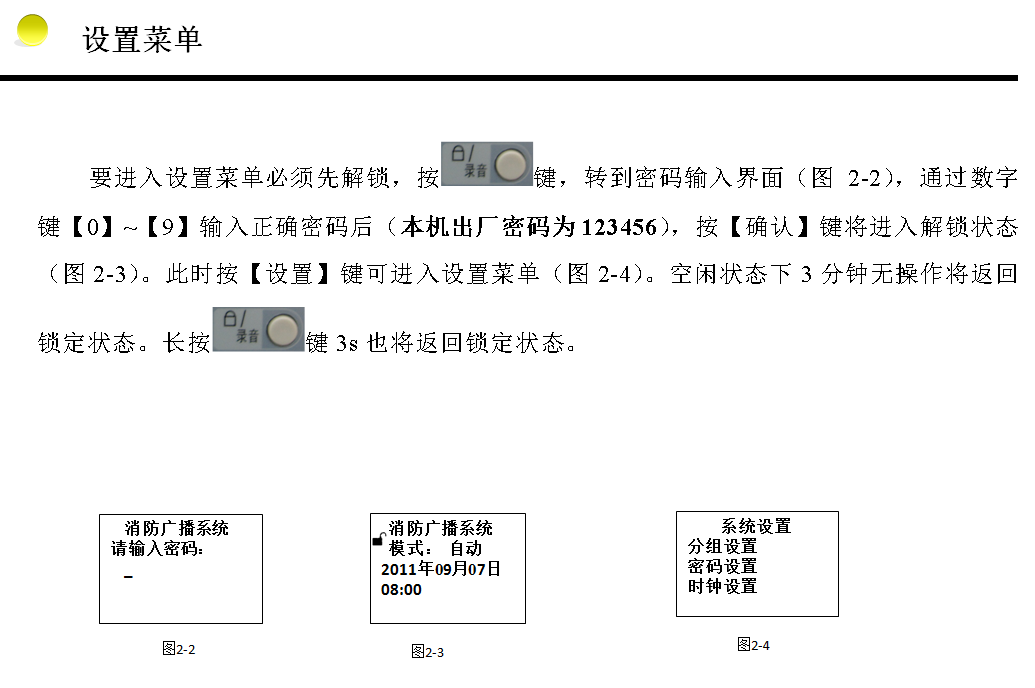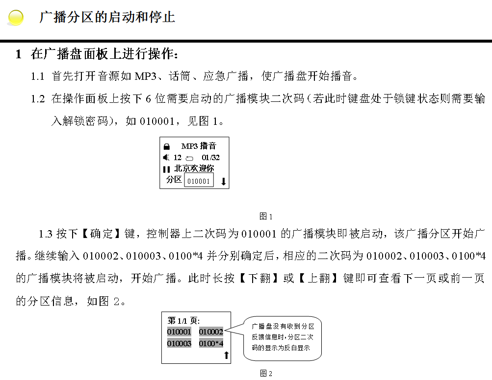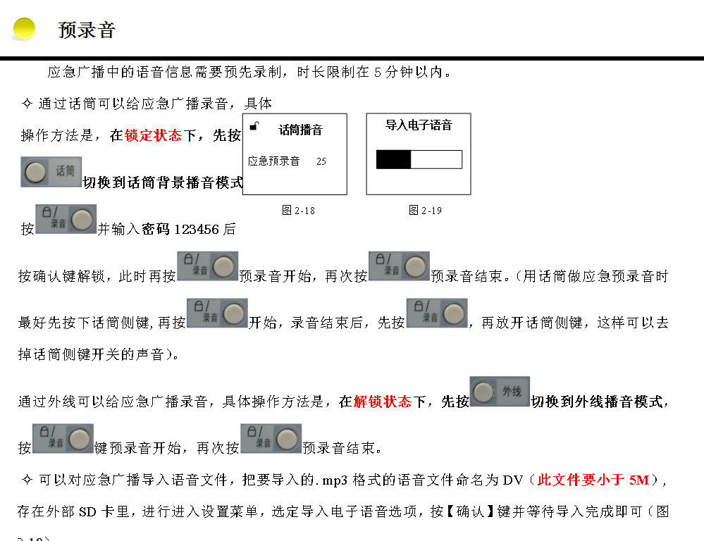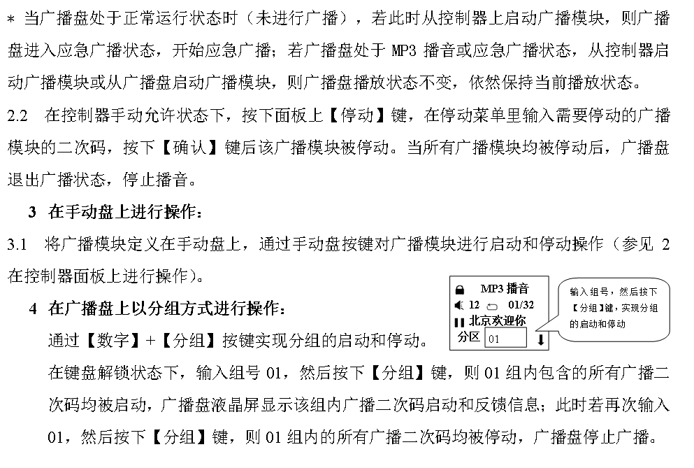 本機有外線、MP3、話筒、應急廣播四種播音模式。其中外線與MP3屬于背景廣播,可自由啟閉。話筒播音包含應急、背景兩種模式。應急廣播單純?yōu)閼笔褂谩?br />