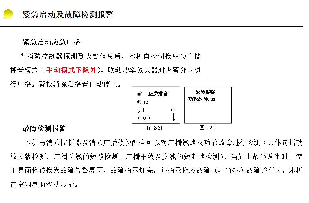 單純作為應急廣播使用,解鎖狀態(tài)下按【應急廣播】鍵或接收到火警信號時自動進入。紅色狀態(tài)指示燈亮,功率放大器輸出音量不可調(diào)節(jié)。