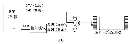 (4)核中警JTGB-ZW-1501型防爆紫外火焰感光探測(cè)器安裝接線(xiàn)示意圖(見(jiàn)圖9)