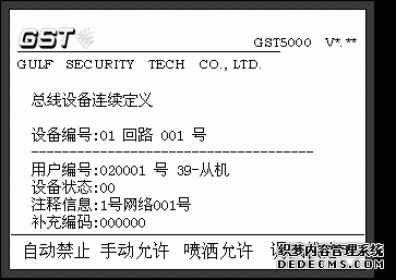GST聯(lián)網(wǎng)時,聯(lián)網(wǎng)控制器必須定義網(wǎng)絡(luò)中所有的控制器。定義方式同總線設(shè)備定義,如圖8-7。進入設(shè)備定義界面,按照圖8-7所示在回路號編輯框中輸入控 制器的聯(lián)網(wǎng)板號,設(shè)備號為要定義的控制器聯(lián)網(wǎng)地址(范圍001-032),如001號是指該條網(wǎng)絡(luò)中的1號從機,002號指的是該條網(wǎng)絡(luò)中的2號從 機,003號指的是3號從機……。用戶編碼是指各個從機的控制器二次碼,設(shè)備類型為39-從機。